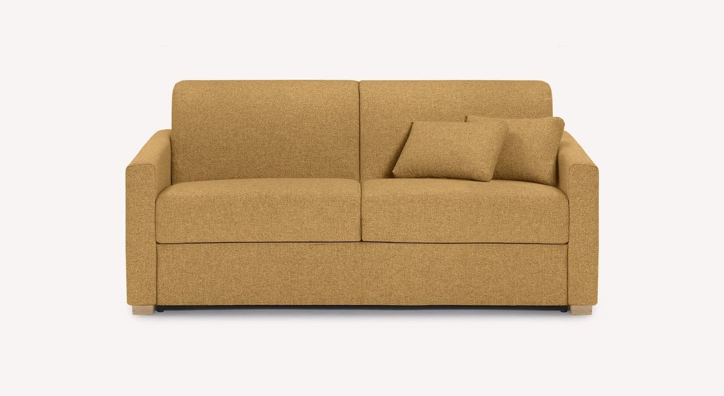 Découvrez le canapé convertible Jerry avec ses accoudoirs classiques et son design épuré pouvant s'adapter à tous types de déco. Il est également disponible avec une méridienne en option.