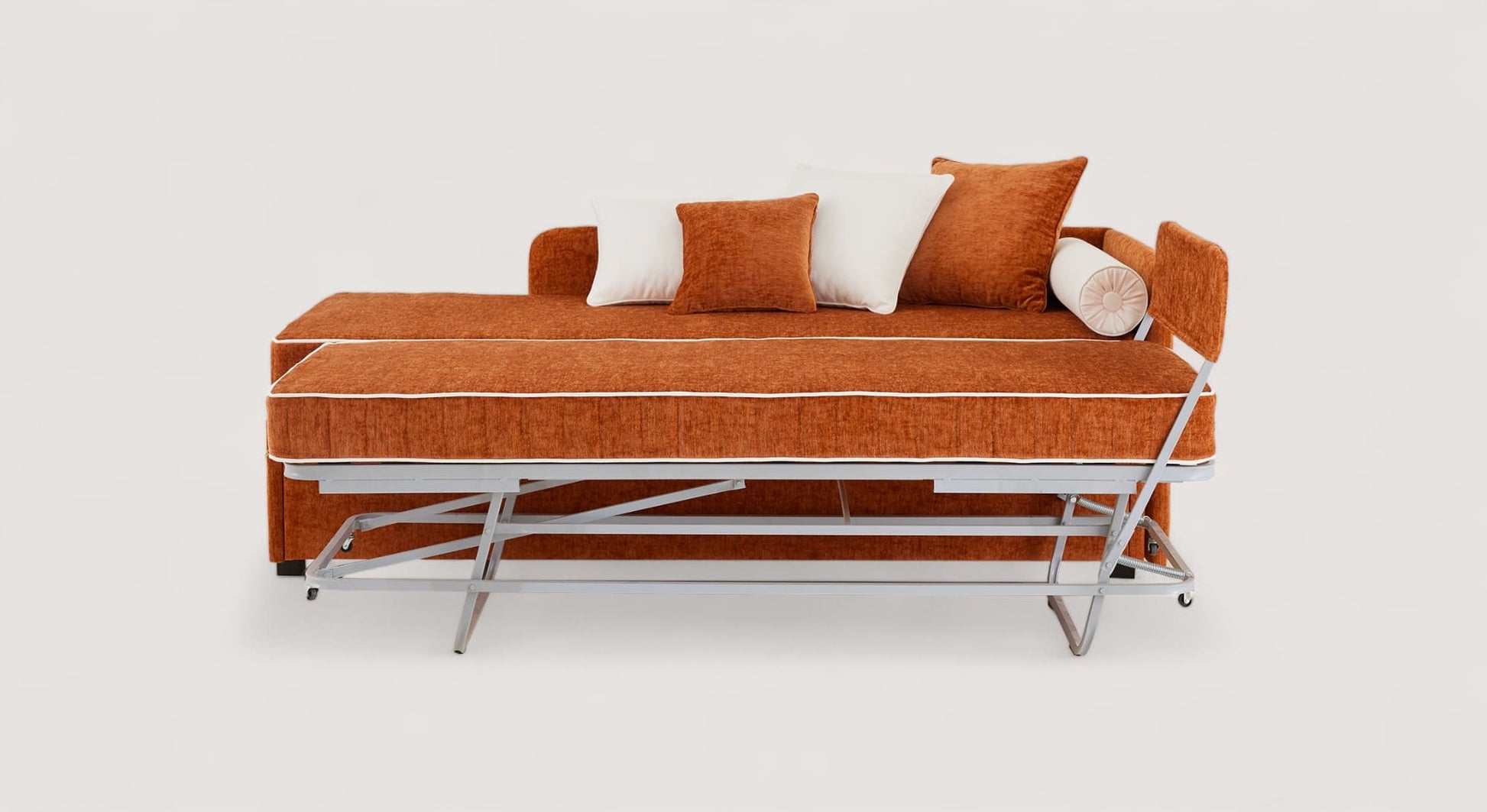 This trundle daybed has an invisible hatch at its base facilitating its conversion into a double bed with a width of 150 cm.
