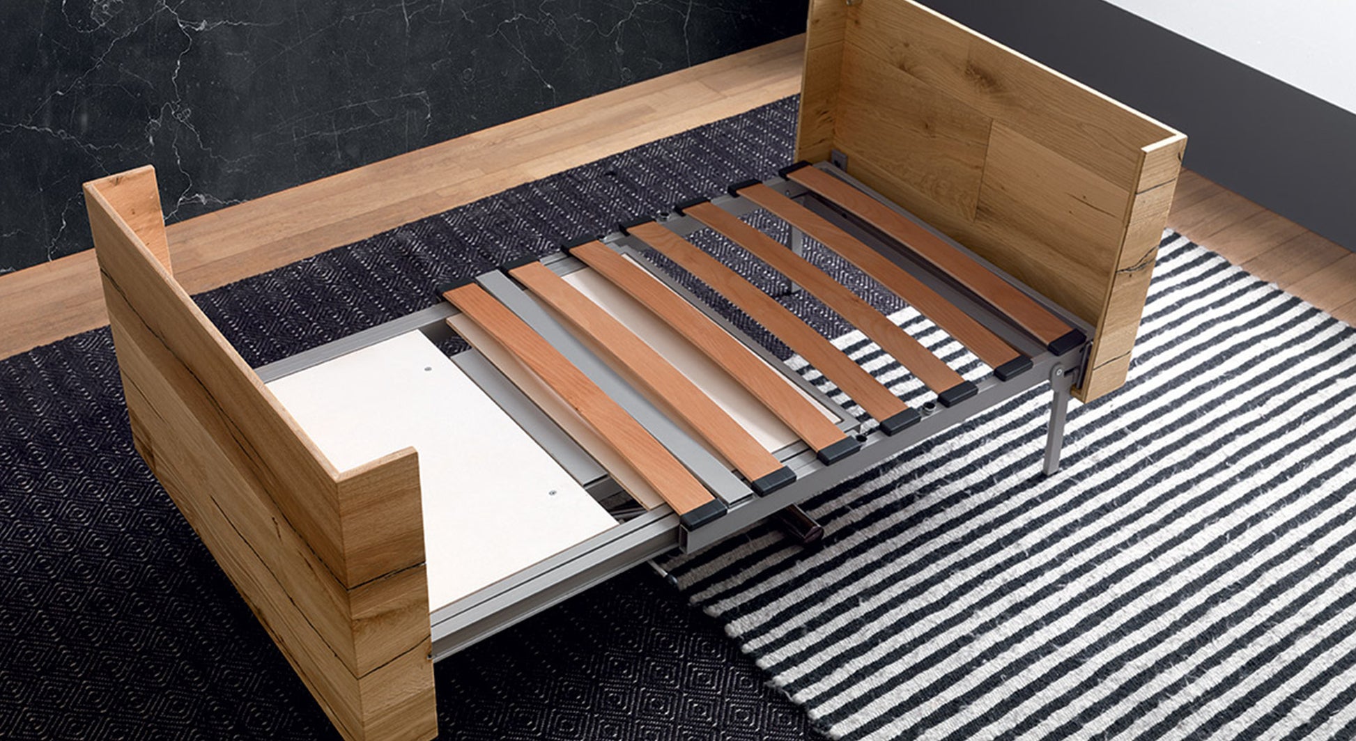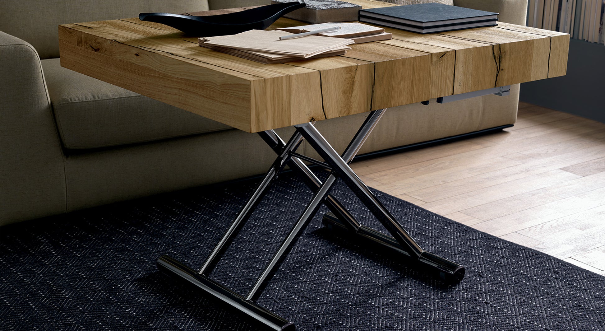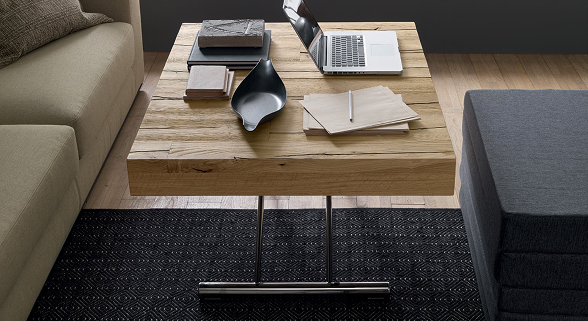 TAVOLETTO represents the more revolutionary and eclectic side of the entire range. A coffee table in real old natural oak, which moves in height to become a dining table and which, if necessary, evolves to create a comfortable bed, with a refined design.