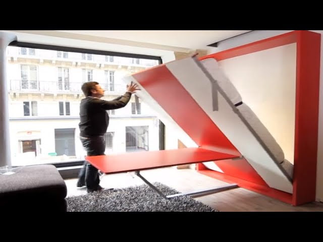 Resolutely elegant, this Italian retractable bed has a transformable system with a vertically folding 2-seater bed which is hidden when closed behind a large table (for 4 people) perpendicular to the front. In addition, thanks to its numerous finishes, colors and coverings available, it will fit perfectly into your decorative space.